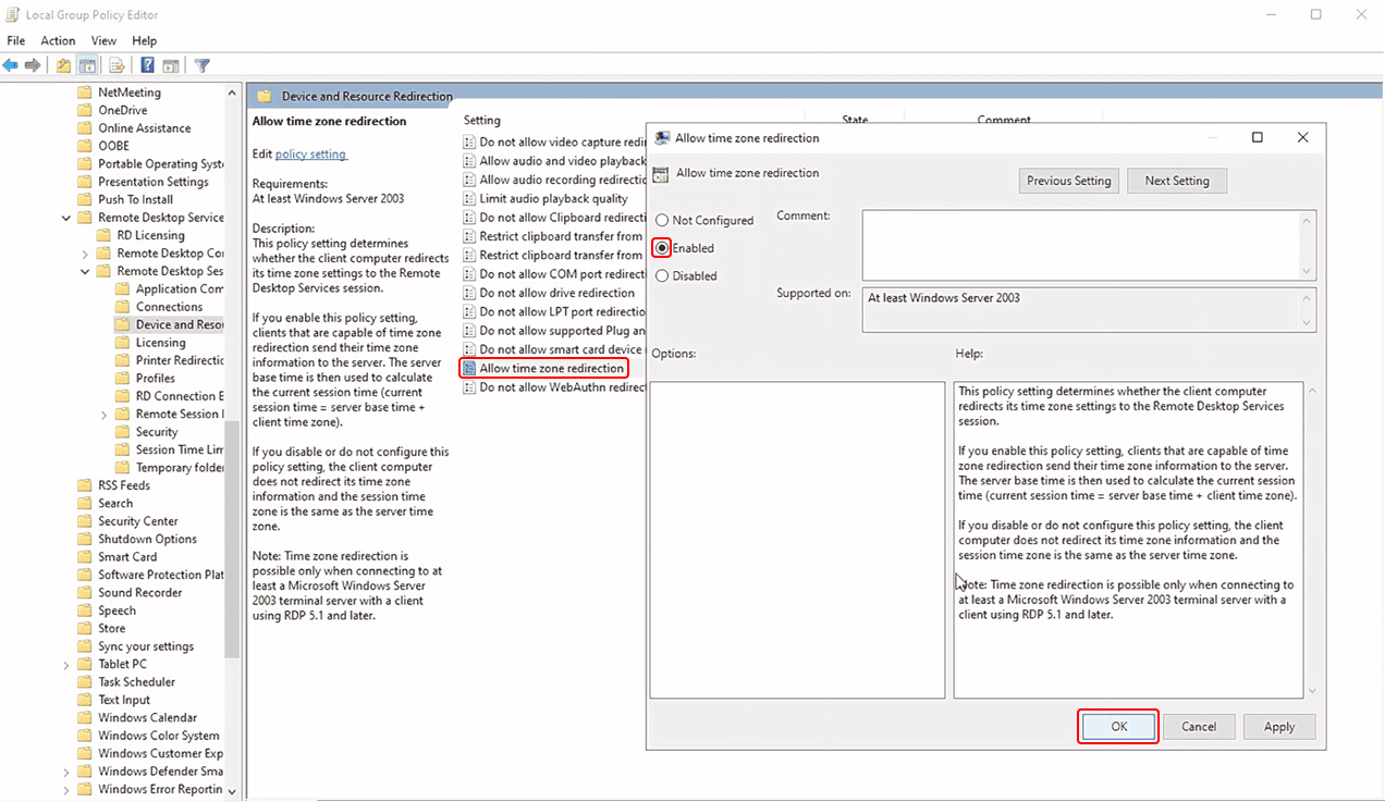 Aktivieren Sie die Zeitzonen-Umleitung über die Gruppenrichtlinien (GPO).