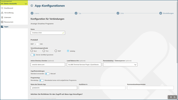 Wenn Sie ein einzelnes Programm (Remote App) in oneclick™ ausliefern wollen (und keinen ganzen Windows Desktop), nehmen Sie folgende Schritte vor: