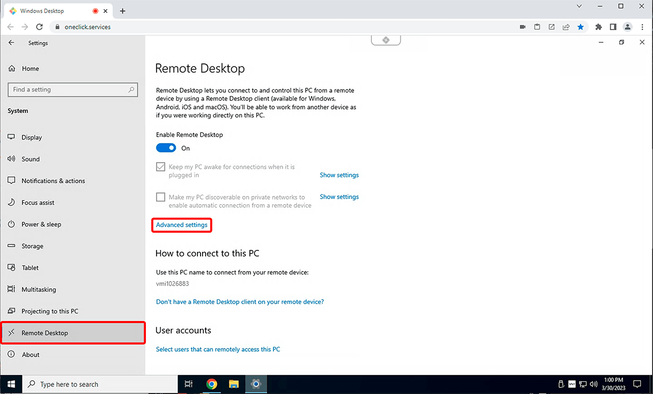 Falls Ihnen diese Option nicht zur Verfügung steht, aktivieren Sie zunächst Remotedesktop auf Ihrem PC indem Sie auf den angezeigten Schalter klicken.