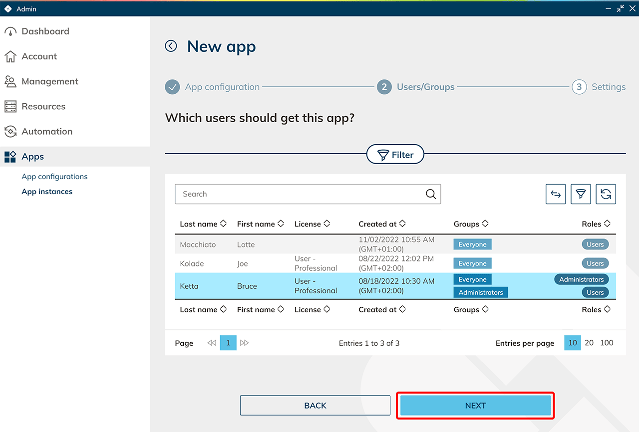 - Wählen Sie die App-Konfiguration, aus der eine App-Instanz erzeugt werden soll und klicken auf Weiter.