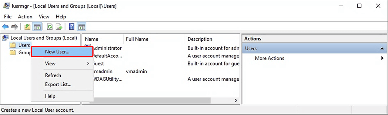 Gehen Sie mit der rechten Maustaste auf Benutzer und klicken Sie dann auf Neuer Benutzer.