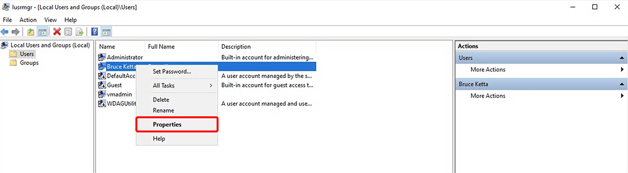 - Gehen Sie mit der rechten Maustaste auf den Benutzer und klicken Sie dann auf Eigenschaften.
