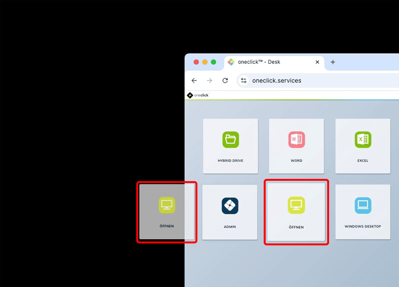 Ziehen Sie die Kachel des oneclick™ Zugriffsfensters per Drag & Drop vom oneclick™ Desk auf Ihren Schreibtisch (Desktop). So erstellen Sie eine Verknüpfung, über die Sie das Zugriffsfenster direkt öffnen können.