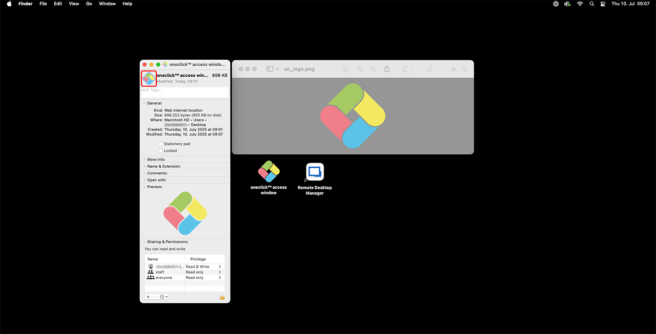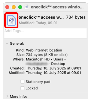 - Machen Sie einen Rechtsklick auf die Verknüpfung zum oneclick™ Zugriffsfenster und wählen Sie Informationen aus dem Menü.