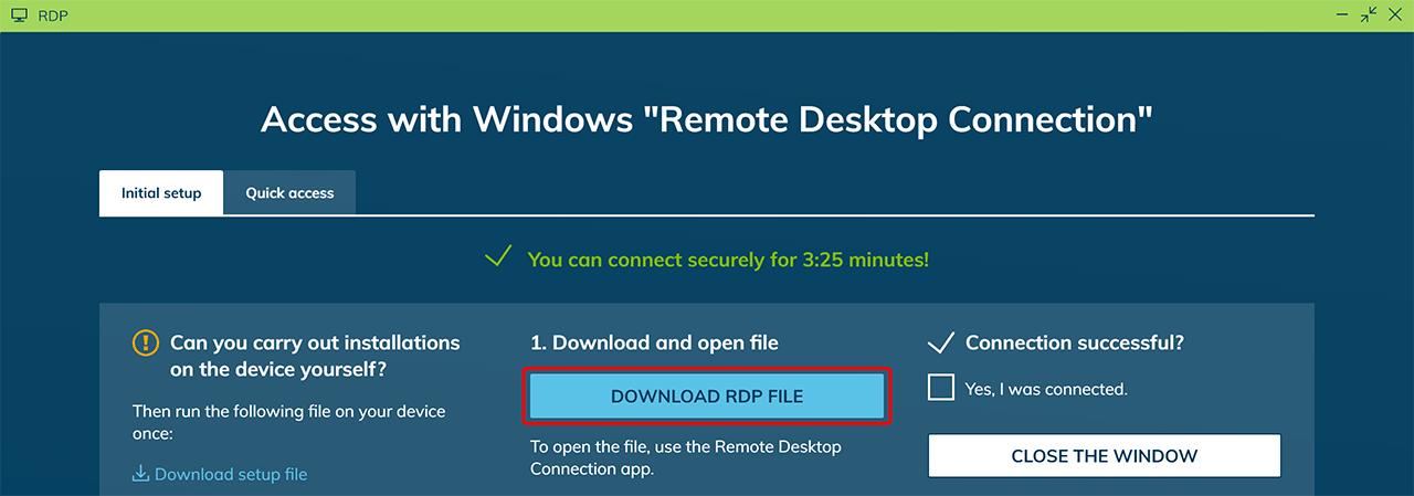 - Im Zugriffsfenster klicken Sie auf den Button RDP-Datei herunterladen..