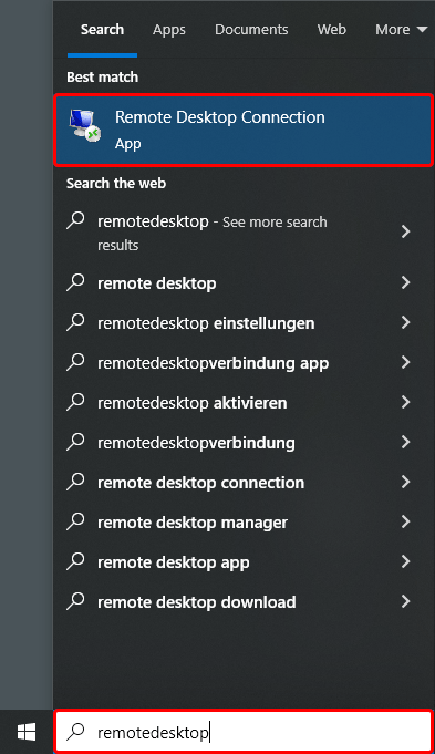 - Geben Sie „Remotedesktopverbindung“ in das Suchfeld der Taskleiste ein und öffnen Sie die Remotedesktopverbindungs-App.