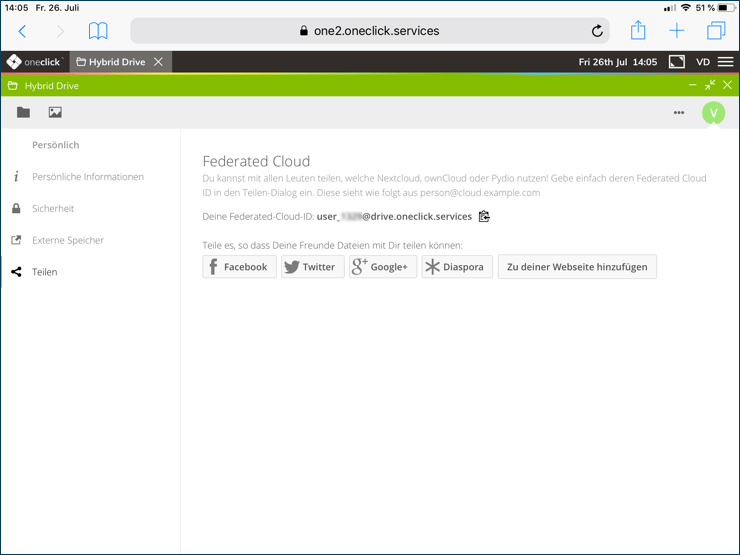 - Klicken Sie auf den Unterpunkt Teilen und kopieren Sie dort die "Federated Cloud ID". Das ist Ihre Serveradresse.