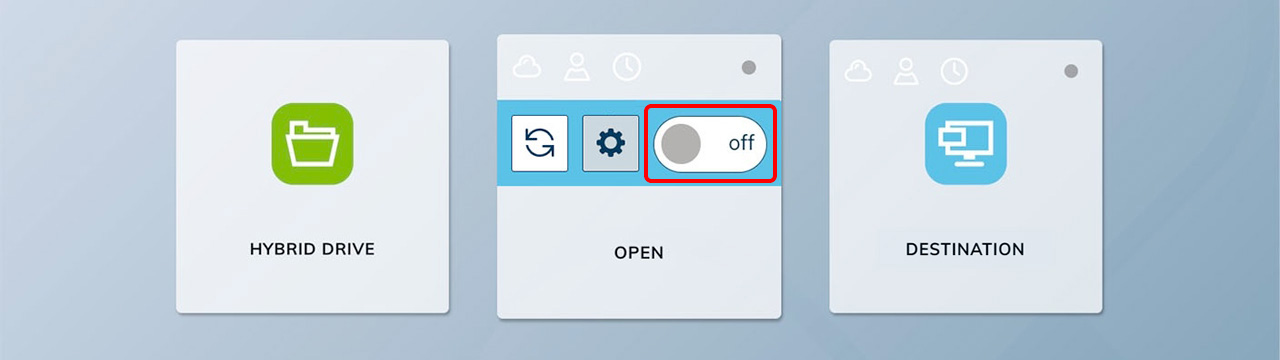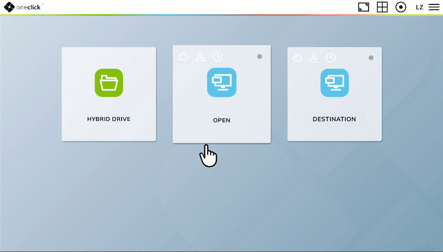 Es gibt Kacheln, über die man mit der Maus fährt, ohne Einstellmöglichkeiten. Dann gibt es welche, mit nur einem Zahnrad in der Mitte und welche, mit Icons und Ein-/Ausschalter. Je nachdem, welche Kachel Sie auf Ihrem oneclick™ Desk haben, sehen Sie im Folgenden, welche Funktionen sich dahinter verbergen.