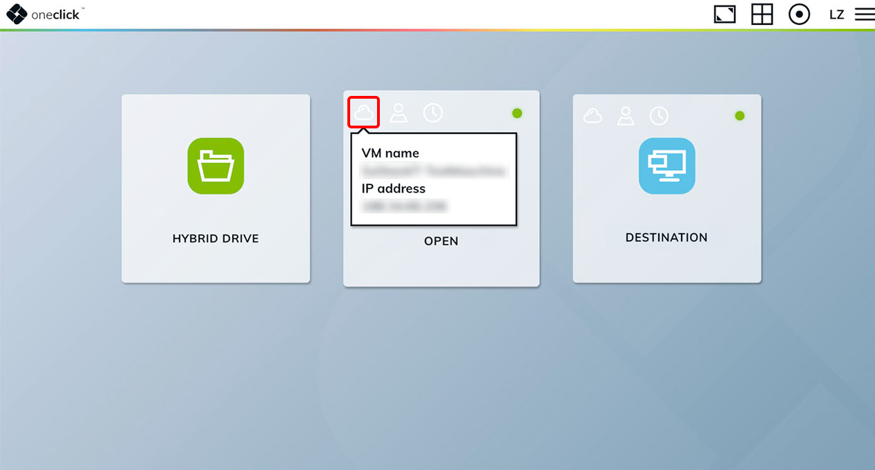 Alle Apps mit einem Wolken-Symbol in der linken Ecke sind Cloud-Ressourcen. Wenn Ihr Administrator es erlaubt hat, sehen Sie die IP-Adresse der VM, indem Sie mit der Maus über das Wolken-Symbol fahren.