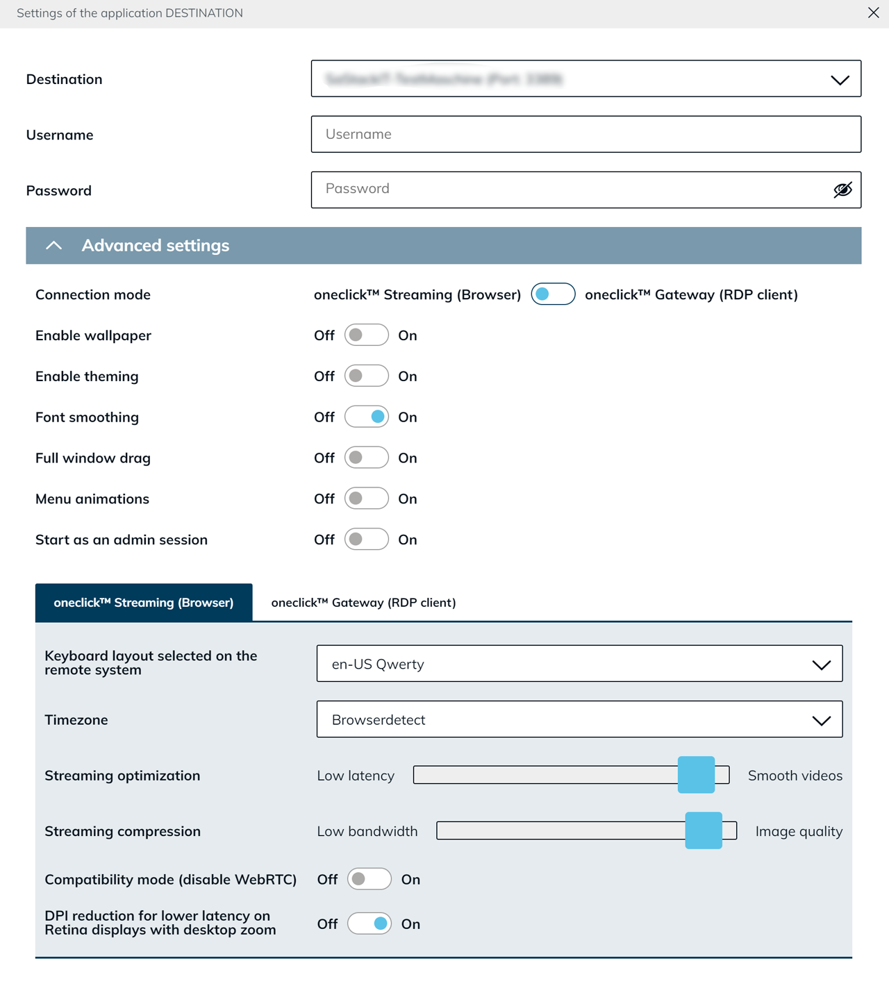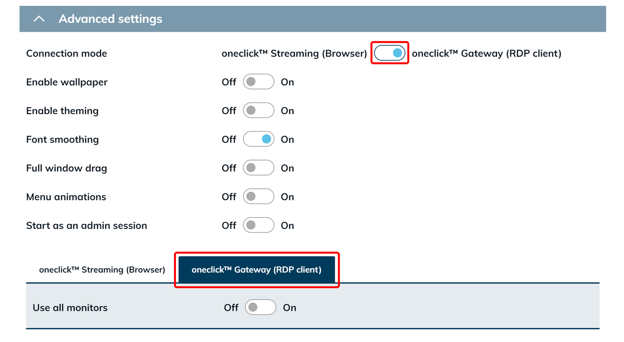 Es kann sein, dass Ihnen in „Erweiterte Einstellungen” zusätzlich eine Auswahloption für das oneclick™ Gateway angezeigt wird. Ob diese Möglichkeit besteht, hängt von den Einstellungen ab, die Ihr Administrator vorgenommen hat. Ist der Schiebeschalter Use oneclick™ gateway sichtbar, können Sie selbst entscheiden, ob die Verbindung über das oneclick™ Gateway oder per direktem Streaming hergestellt werden soll.