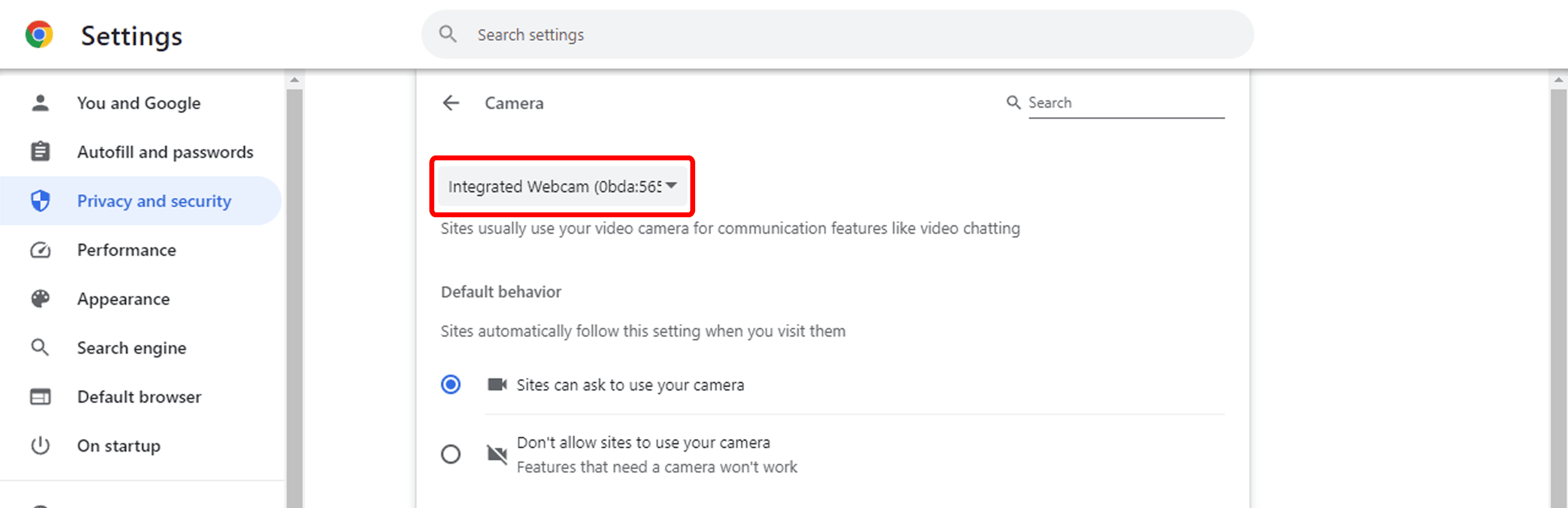- Ändern Sie die Einstellung der Standard-Kamera durch Auswahl einer anderen, indem Sie auf den Abwärtspfeil klicken.