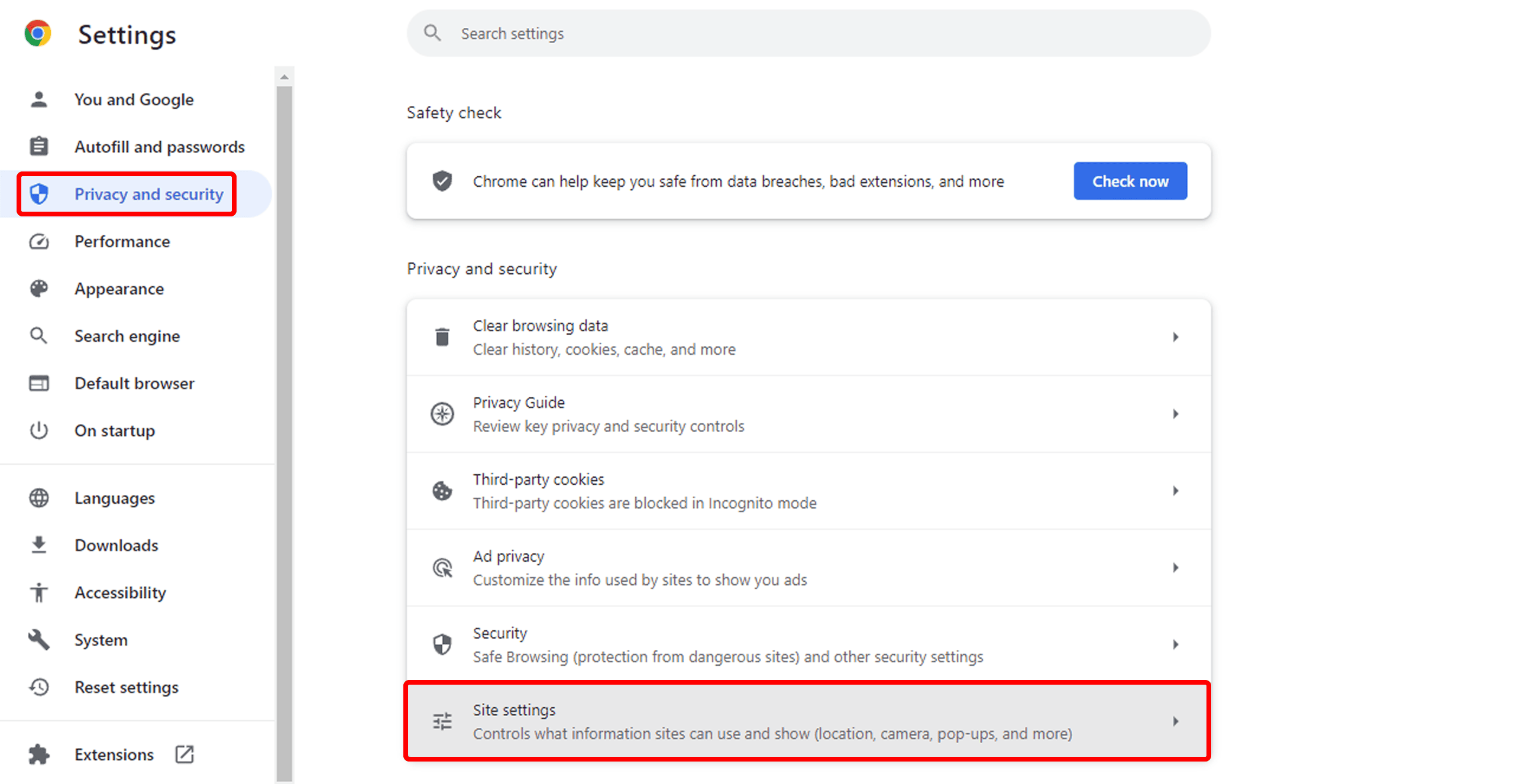 - Klicken Sie anschließend links auf den Reiter Datenschutz und Sicherheit und dann auf Website-Einstellungen.