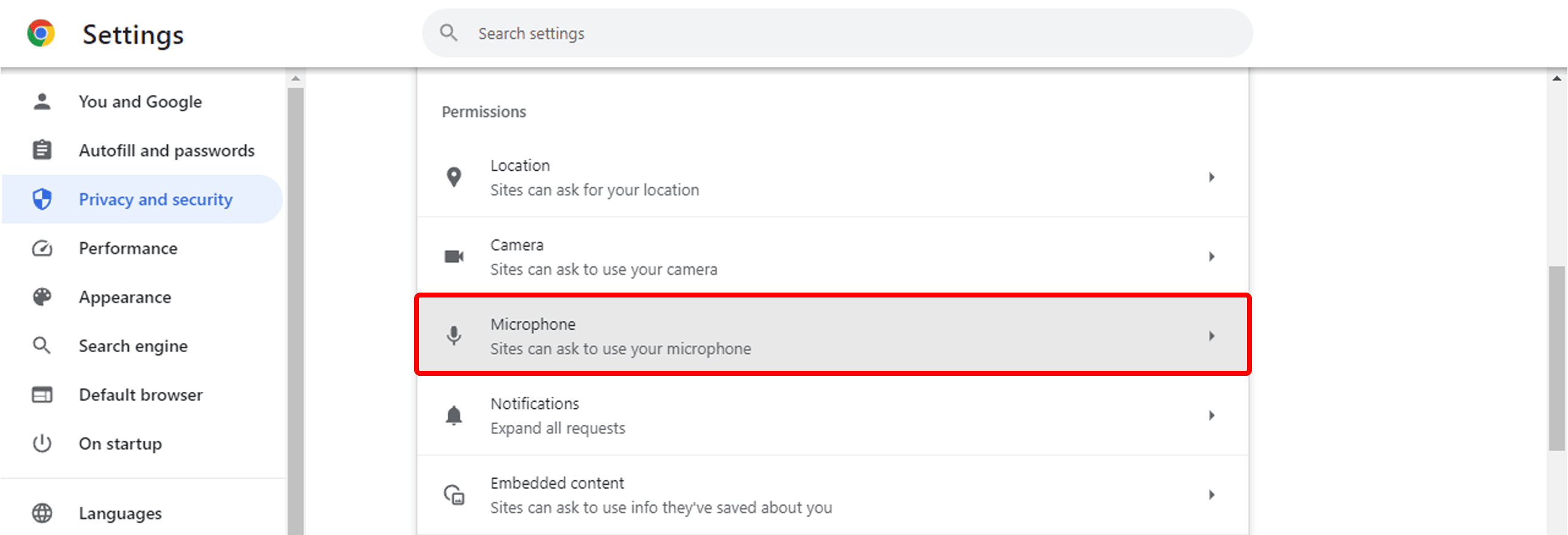 - Scrollen Sie auf der Einstellungsseite nach unten, bis Sie den Abschnitt Mikrofon erreichen und klicken Sie darauf.