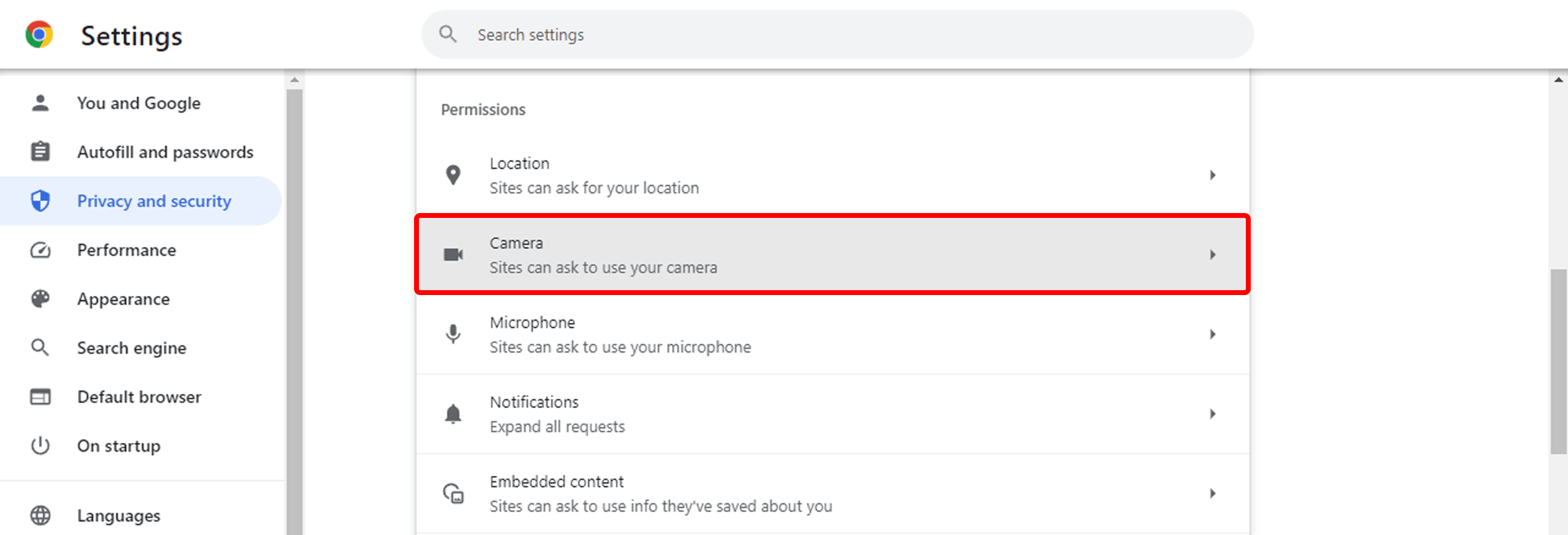 - Scrollen Sie auf der Einstellungsseite nach unten, bis Sie den Abschnitt Kamera erreichen und klicken Sie darauf.