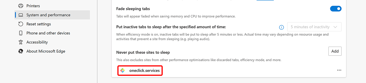 - Unter dem Punkt „Leistung optimieren“ finden Sie den Eintrag „Diese Websites nie in den Standbymodus versetzen“.