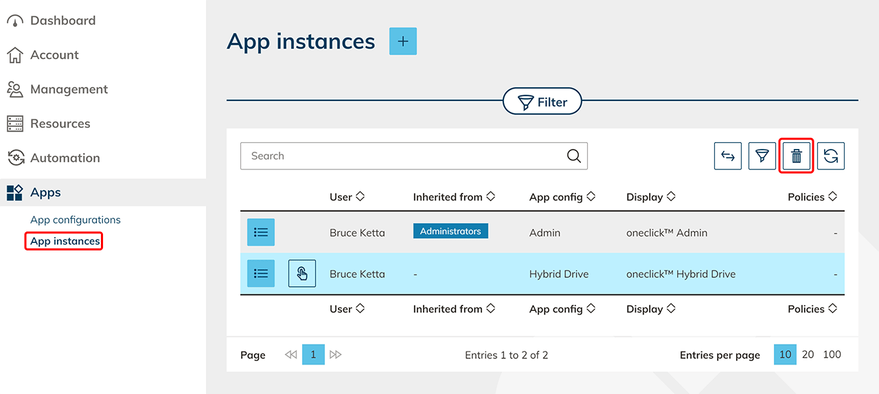 If you want to delete more than one app instance at once, you can select multiple rows and then click on the Delete icon next to the search bar.