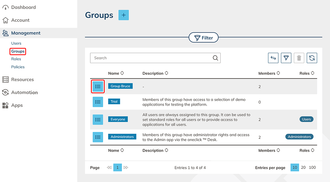 To access the detail page, click on the List icon in the row of the group where the app must be deleted.