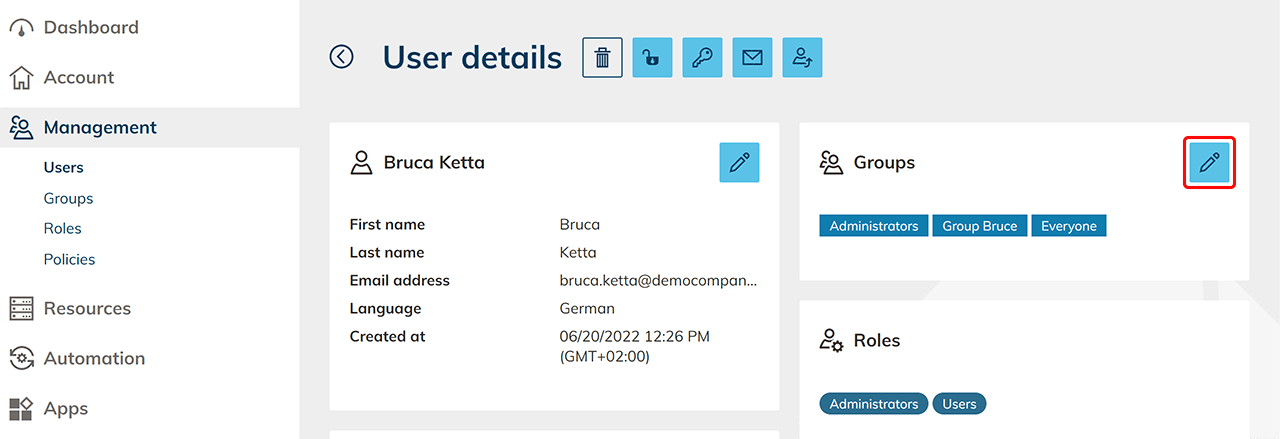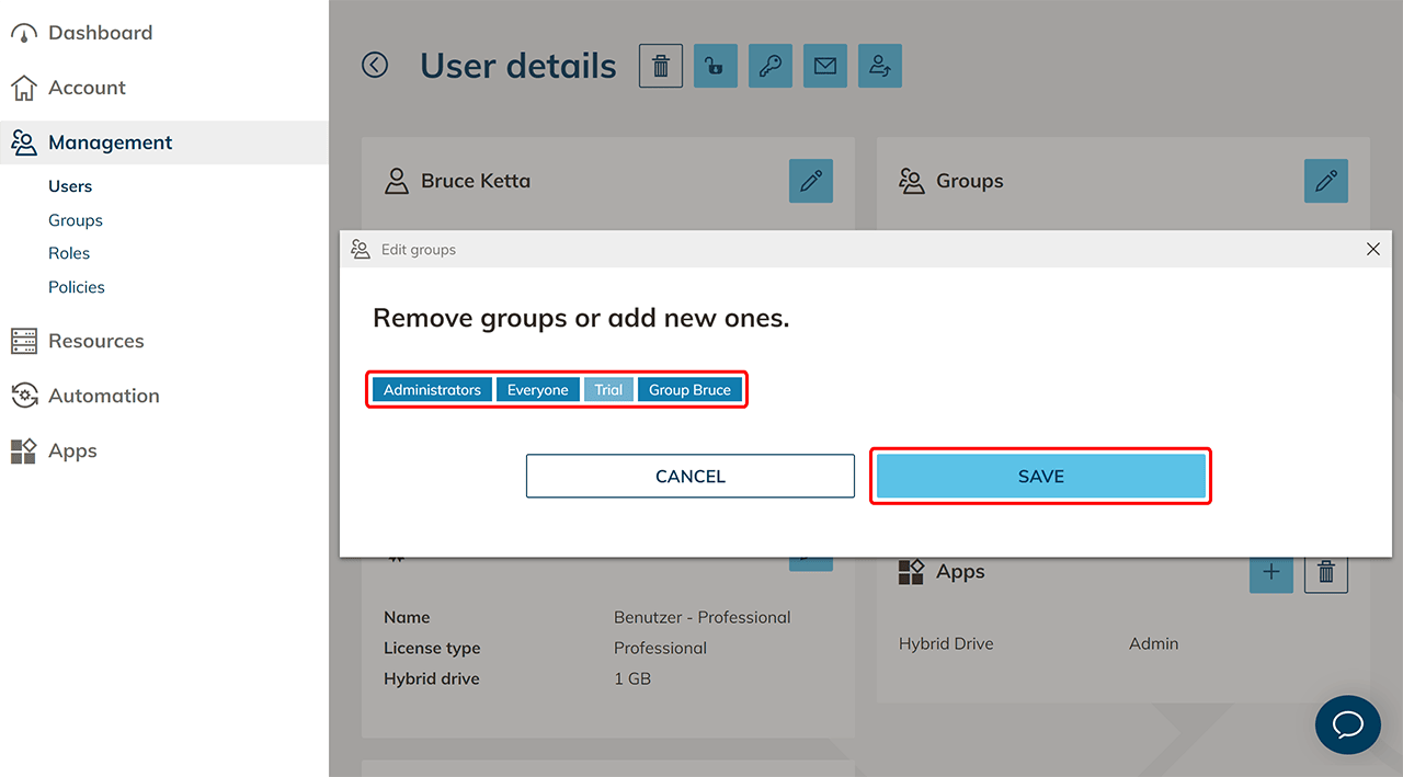 Click in the tile "Groups" on the Pencil icon and select the group with the app on which the user should have no access anymore. Click on Save. In the tile "Apps" you can now see what app was withdrawed from the user. Please notice that the access data for the deleted app will also be deleted.