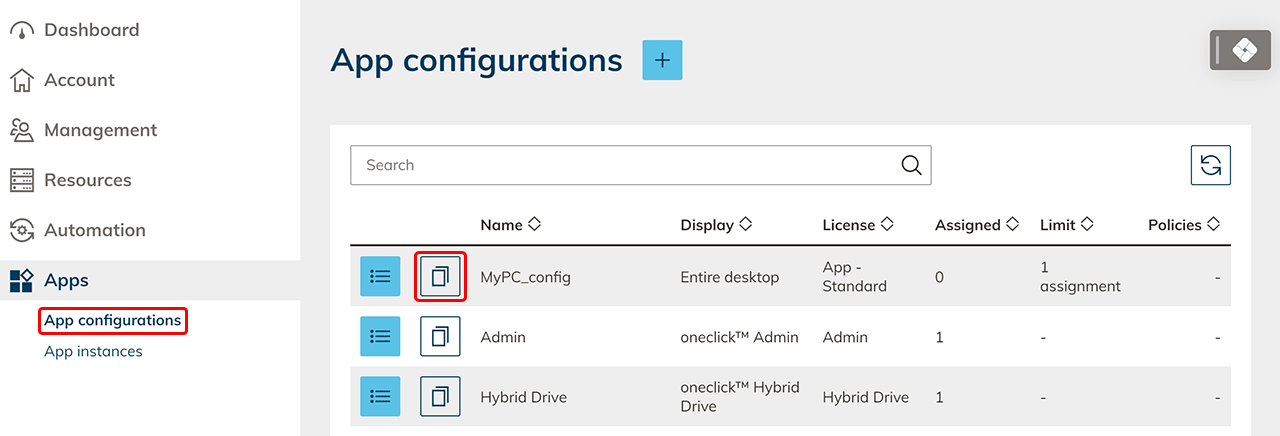 - Click on the Apps tab in the oneclick™ menu and then on App configurations.