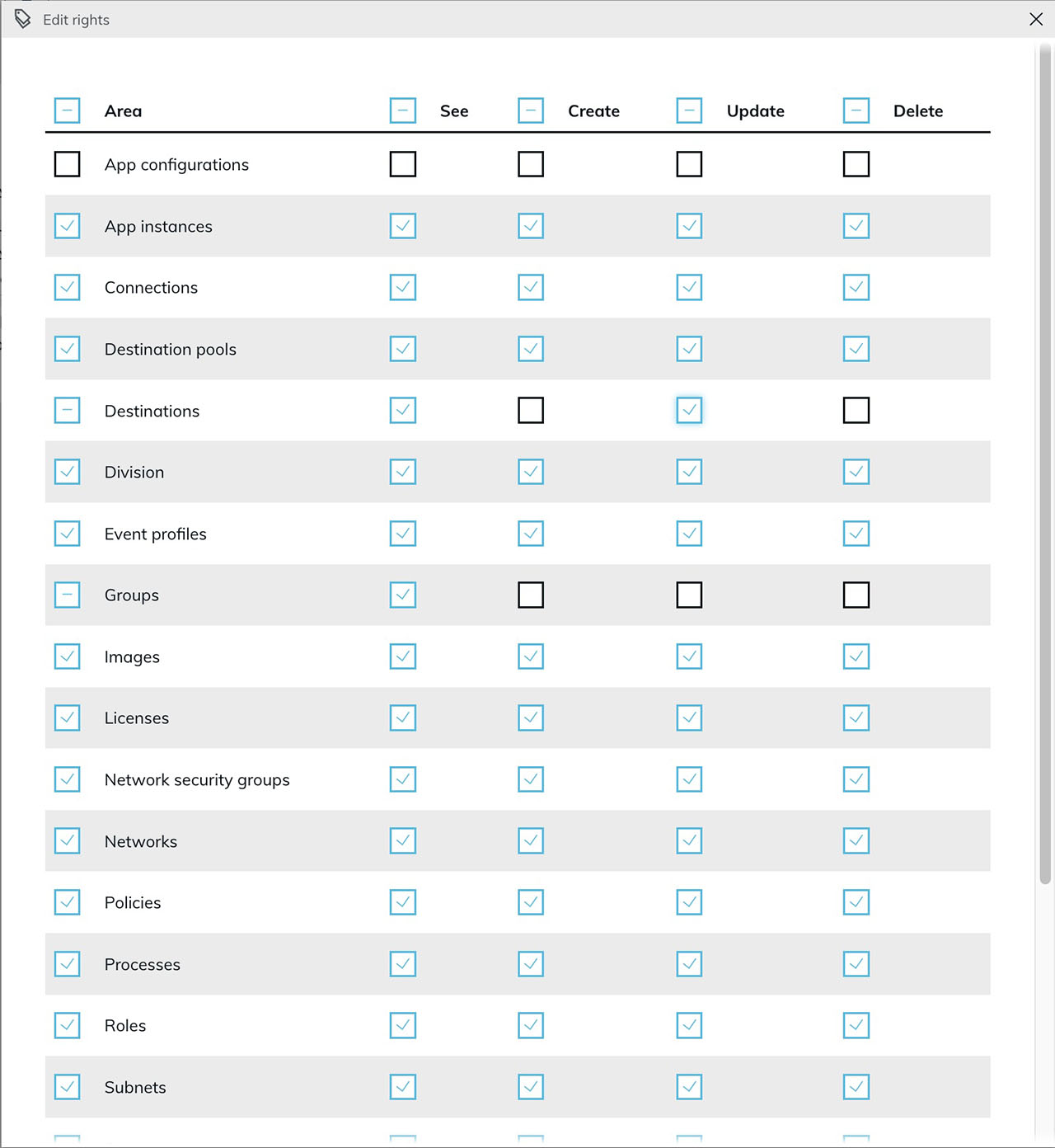 Permissions in the roles management view can now be selected or deselected per column using header checkboxes. Each row also has a leading checkbox to toggle all permissions for a single resource at once. This makes it significantly faster to set up common role configurations such as read-only or no-delete roles.
