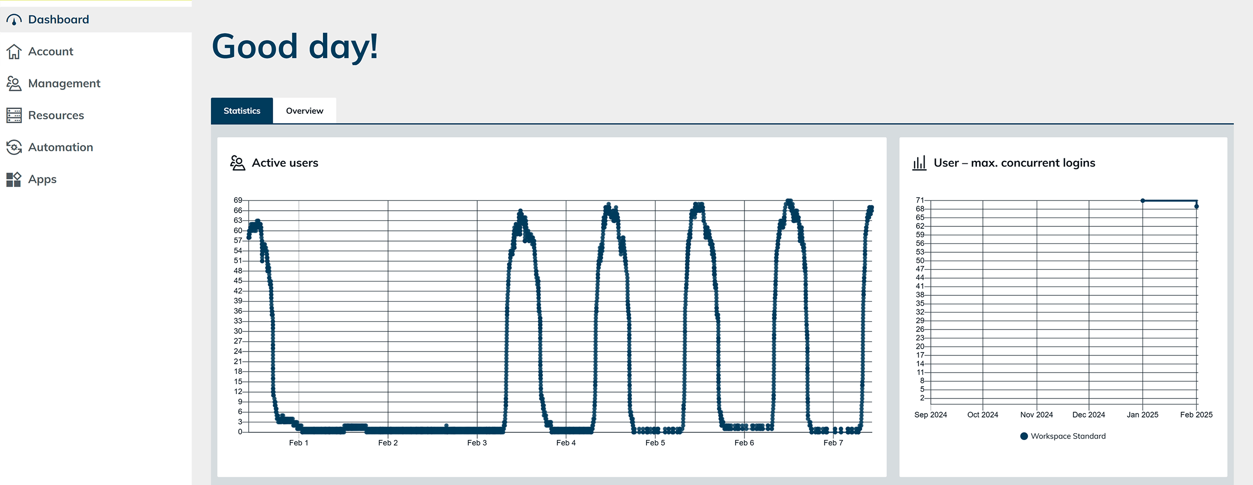 In addition to active users, the maximum number of concurrent users is now displayed. If you have multiple user licenses, you can also see the maximum concurrent logins per license.