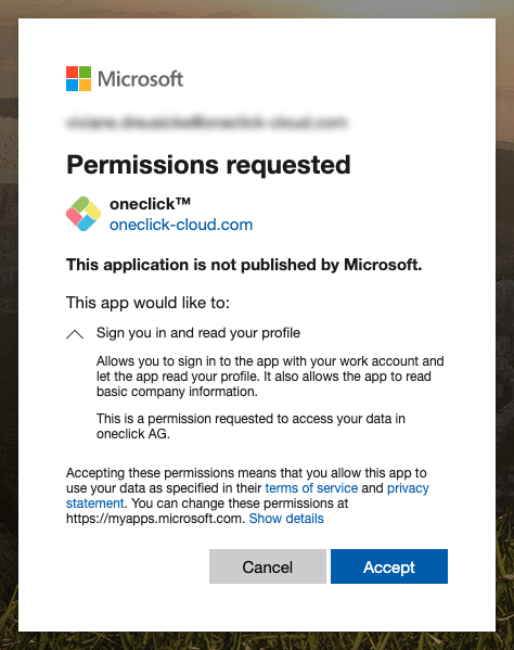- The first time you log in, you must give oneclick™ permission to use your login data from Entra ID.