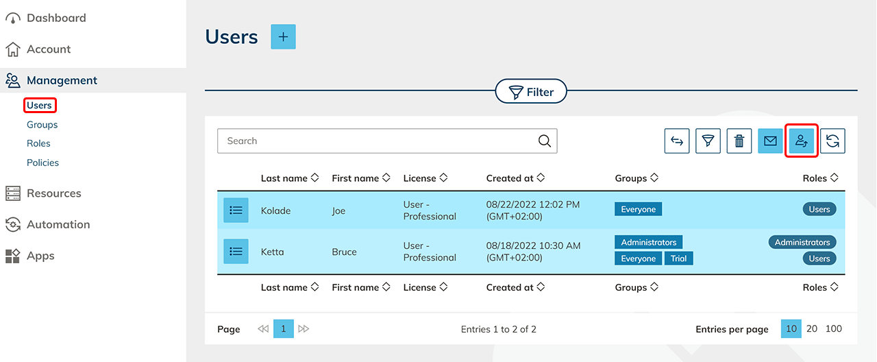 Select all users in the table you want to push into the AD. If you want to write just one user to a connected AD you can click on the List icon in the row of the user to get to the detail page.