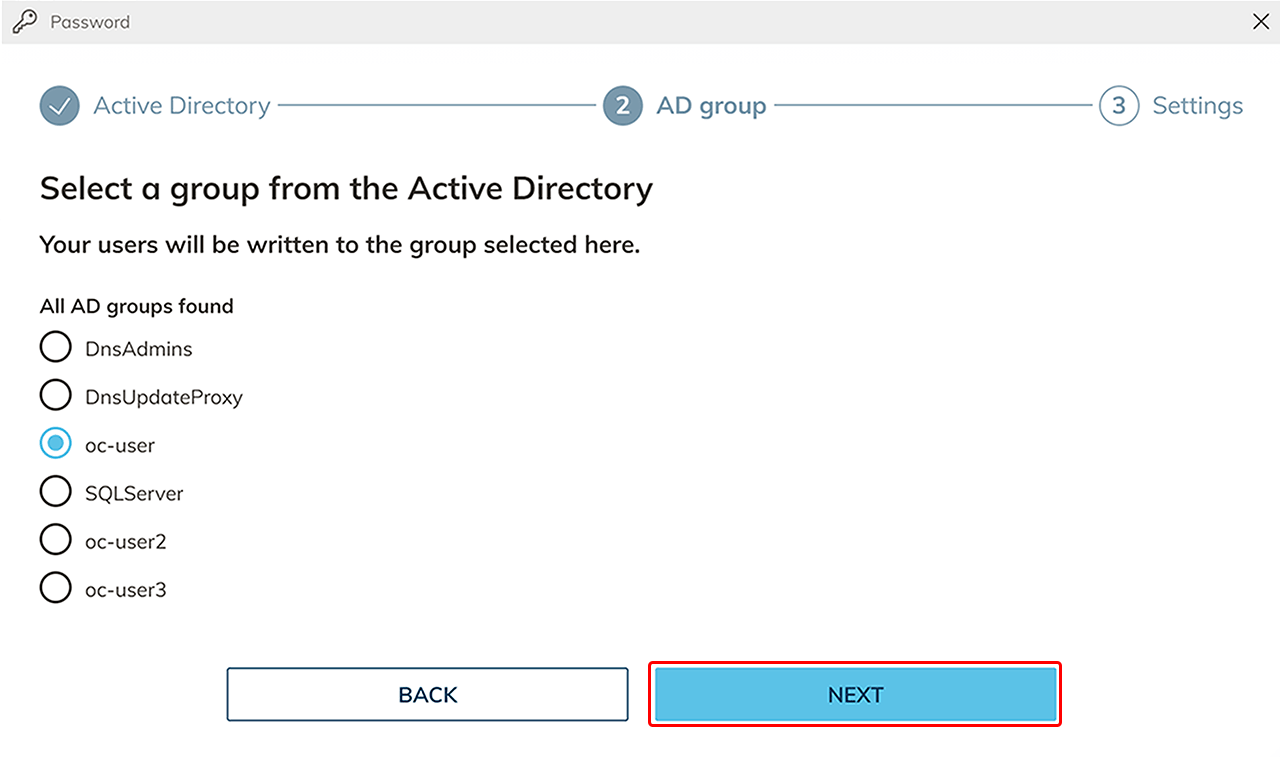 - Do not select a group in the step where you can synchronize the groups from your Active Directory with the groups in oneclick™.