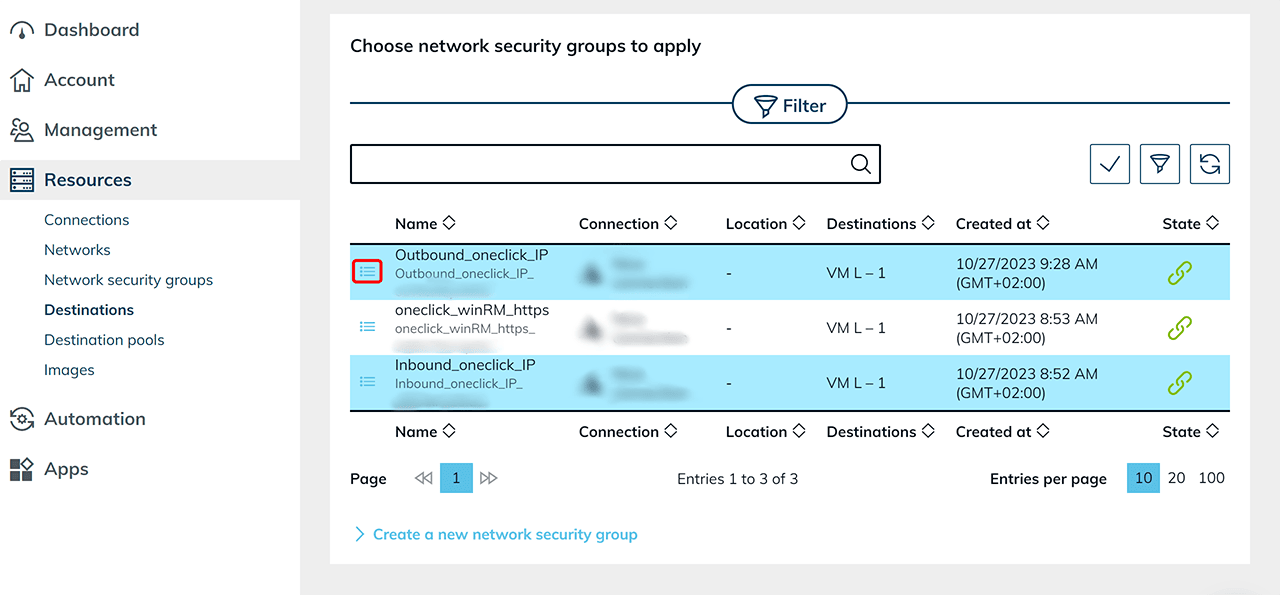 If supported by your cloud provider, you can select one or more NSGs here. Click on the List icon to go to the details page of the corresponding NSG: Check whether access is authorised by oneclick and whether your cloud provider requires a rule for outgoing traffic.