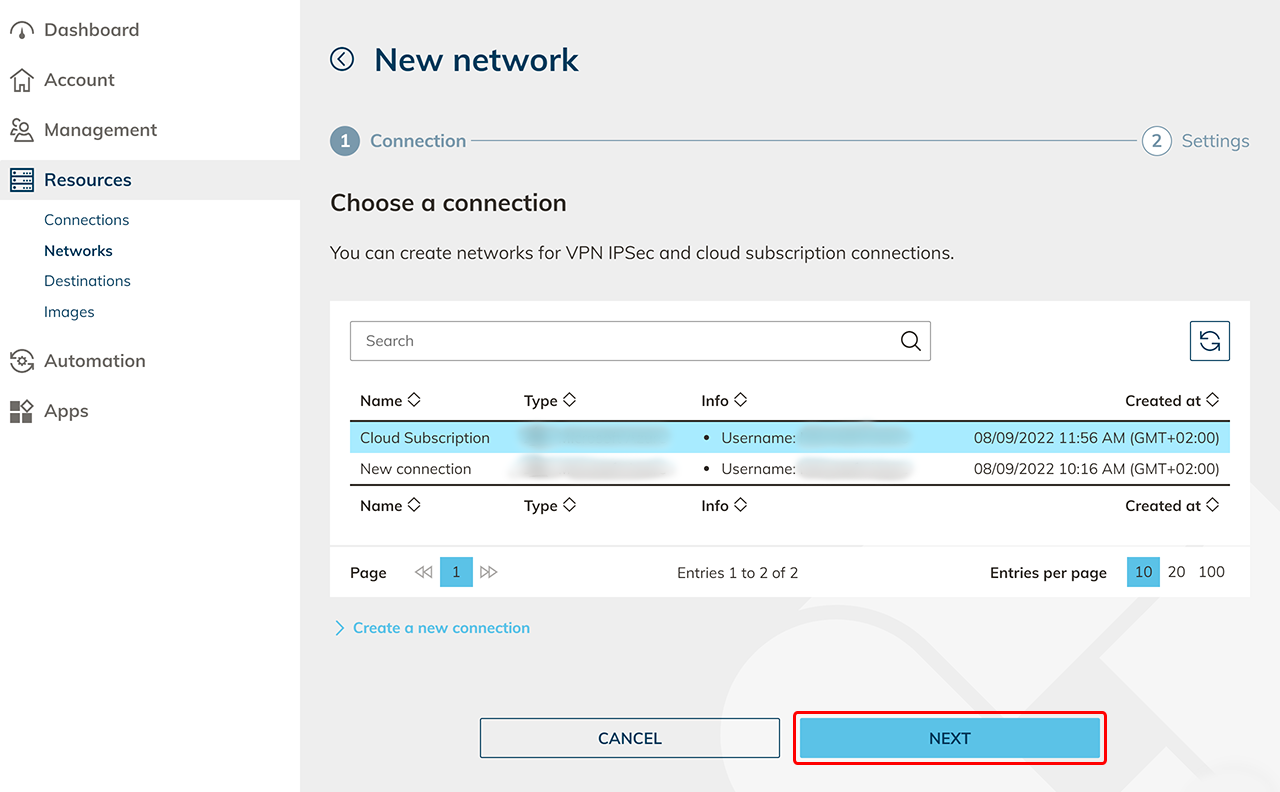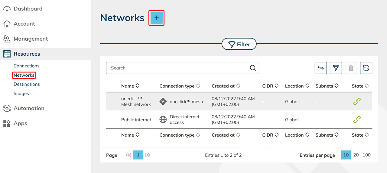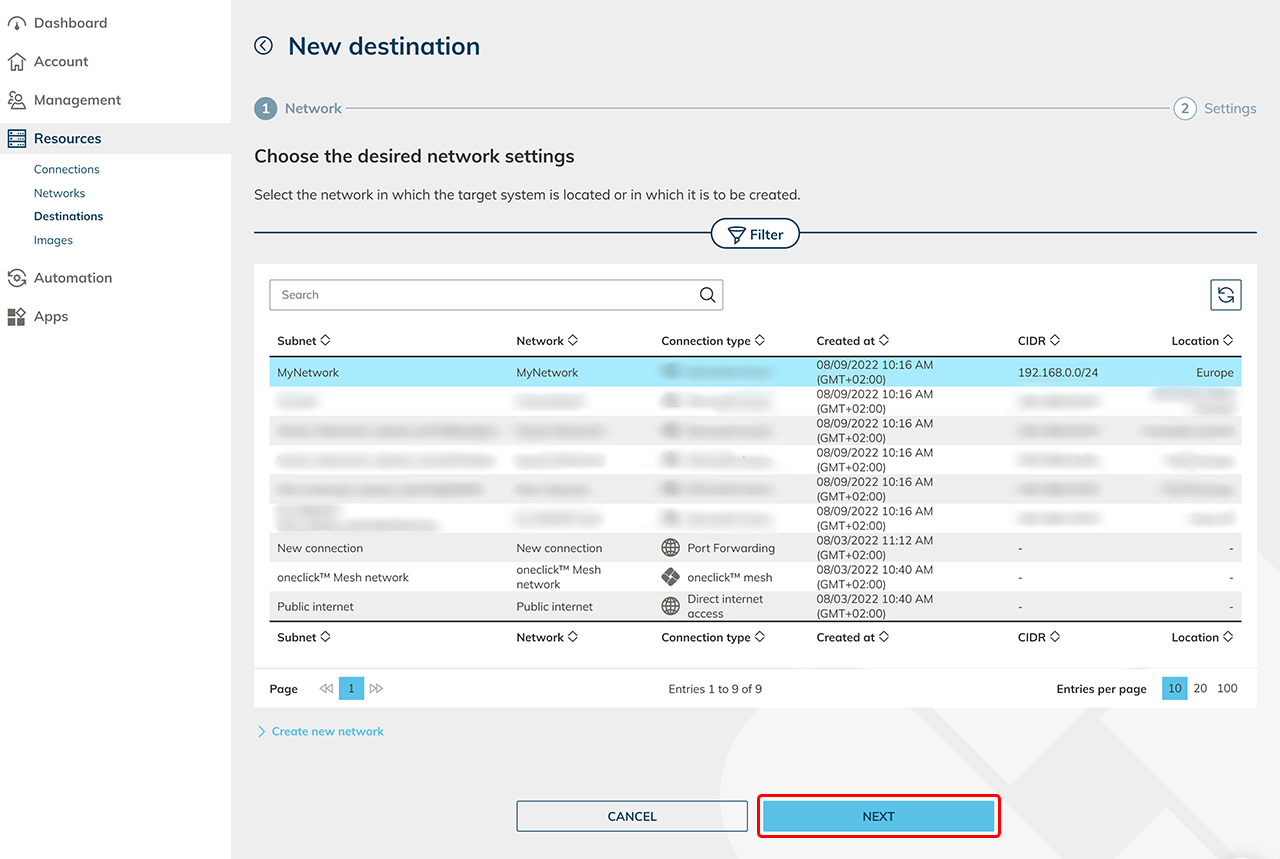 Networks that already exist in your cloud subscription are automatically read out by oneclick™ and will appear in the displayed list. Carry out the following steps to create a new network: