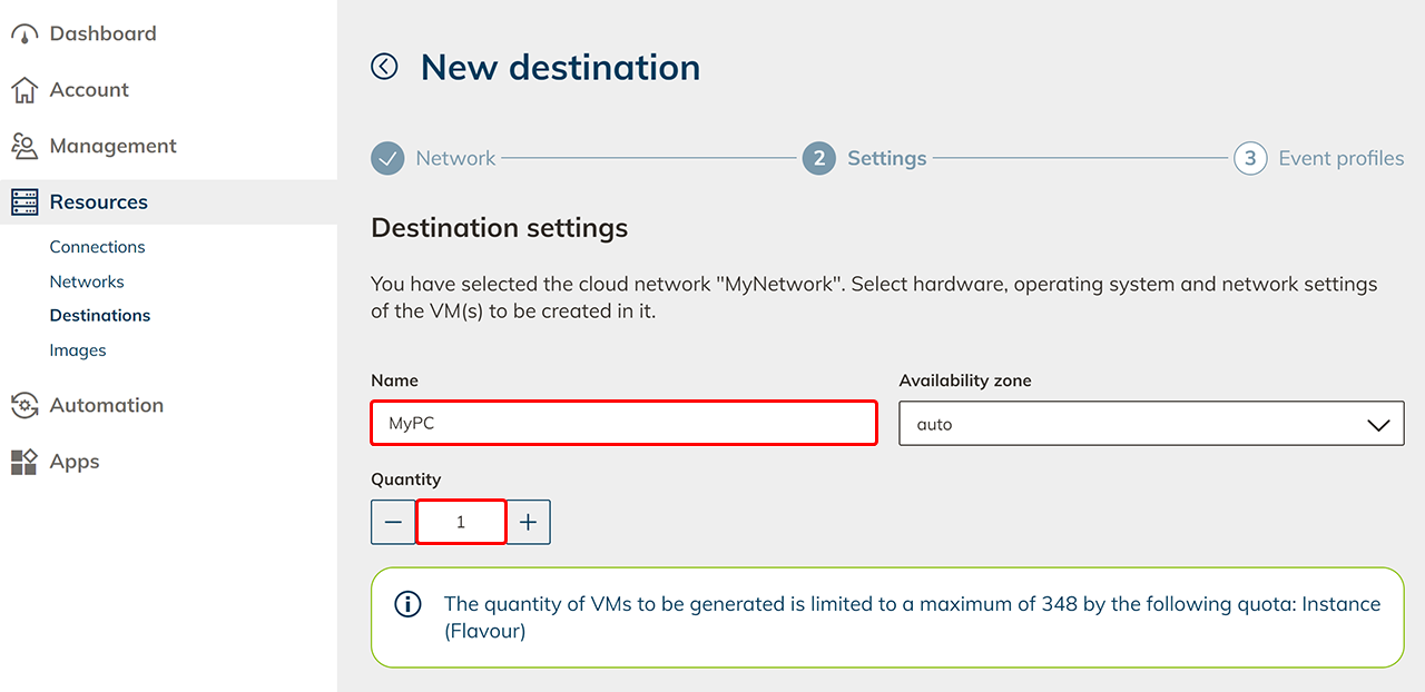 Give your VM a meaningful name. Creating multiple virtual machines with identical settings, these will be numbered consecutively by adding a number at the end of the name, e.g. VM - 1, VM - 2. You can optionally display this name for your users.
