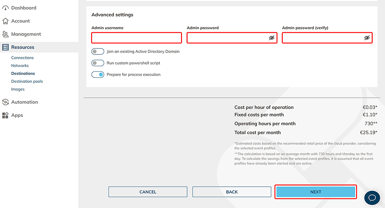 Preparing your resource for process execution is activated by default. To be able to use the process function via oneclick™, WINRM is activated on your resource. If you do not want to use this function, deactivate it and an estimated price per month will be displayed. Click on Next. The prices displayed are updated on an ongoing basis. The official prices of the respective cloud provider are always relevant for billing.