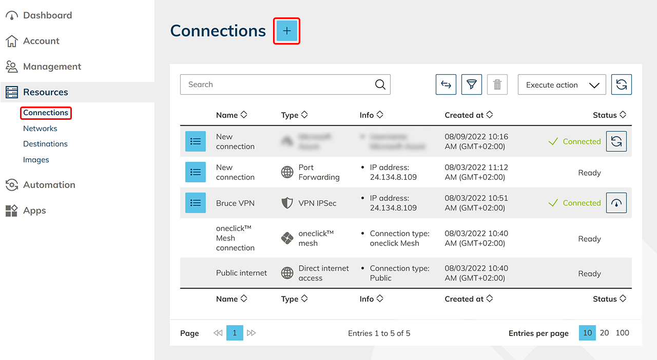 - Your subscription is now connected. Existing networks and VMs are automatically read out and stored in the Resources tab under the corresponding item. If supported byyour cloud provider, oneclick™ will also read out all existing network security groups (NSG) in your subscription.