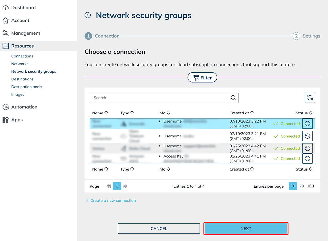 If supported by your cloud provider, NSGs that are already existing in your cloud subscription, for example, are automatically read by oneclick™ and can be selected when creating or editing a destination. If not supported by your cloud provider, you may not be able to create your own NSGs.
