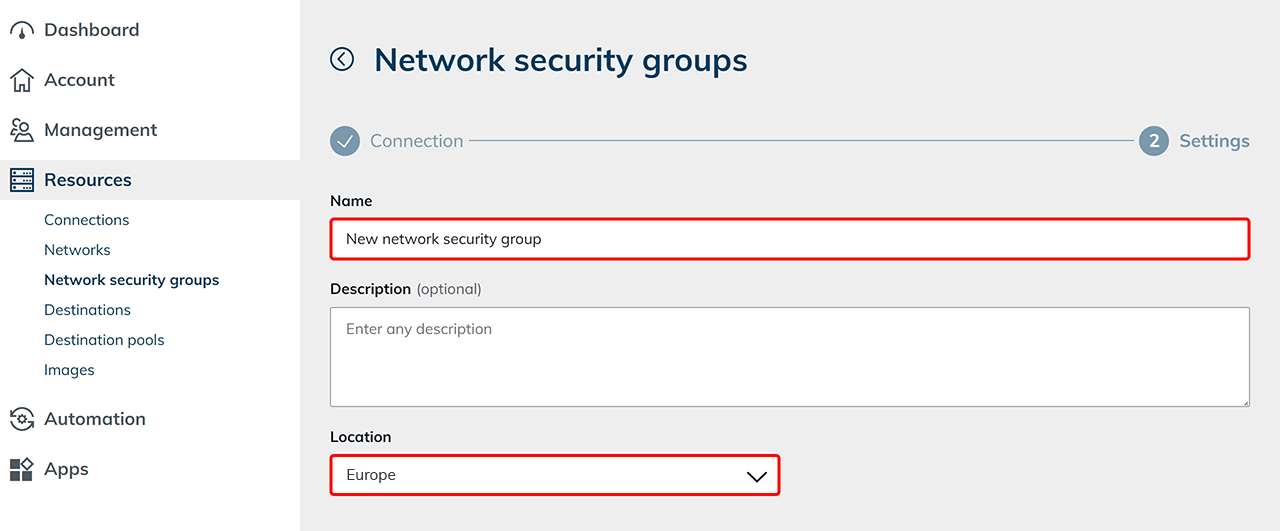 In the next step, enter a name and select a suitable location. Optionally, you can also add a description here.