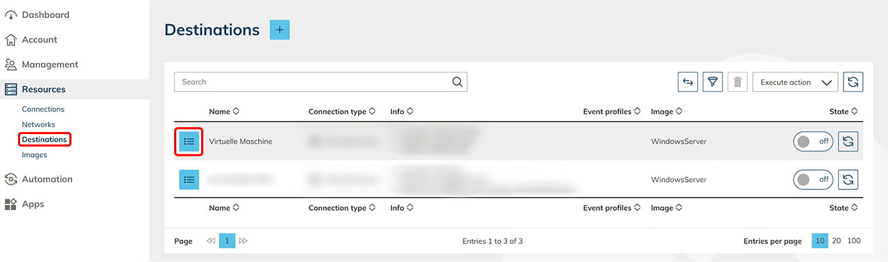 - Now go to the Destinations tab and click on the List icon in the row of your virtual machine to get to the detail page.