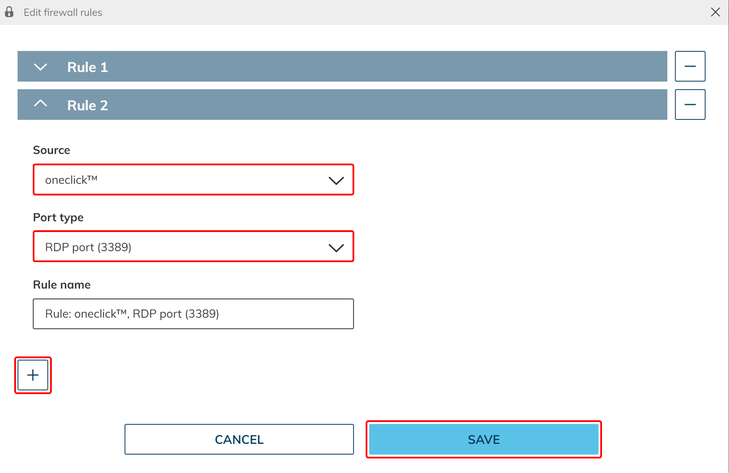 Select the "Source" oneclick™ and select the appropriate "Port Type", such as RDP Port (3389) for a Windows Server. Add a new firewall rule using the + Icon. Click Save.
