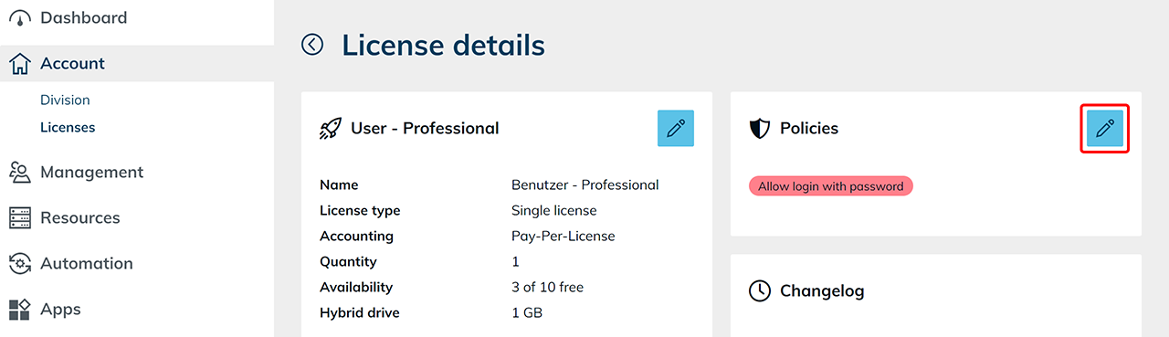 If a user was imported from an Active Directory, login is performed by default using AD credentials. A login with a oneclick™ password is only possible if the “Allow login with password” policy is enabled.