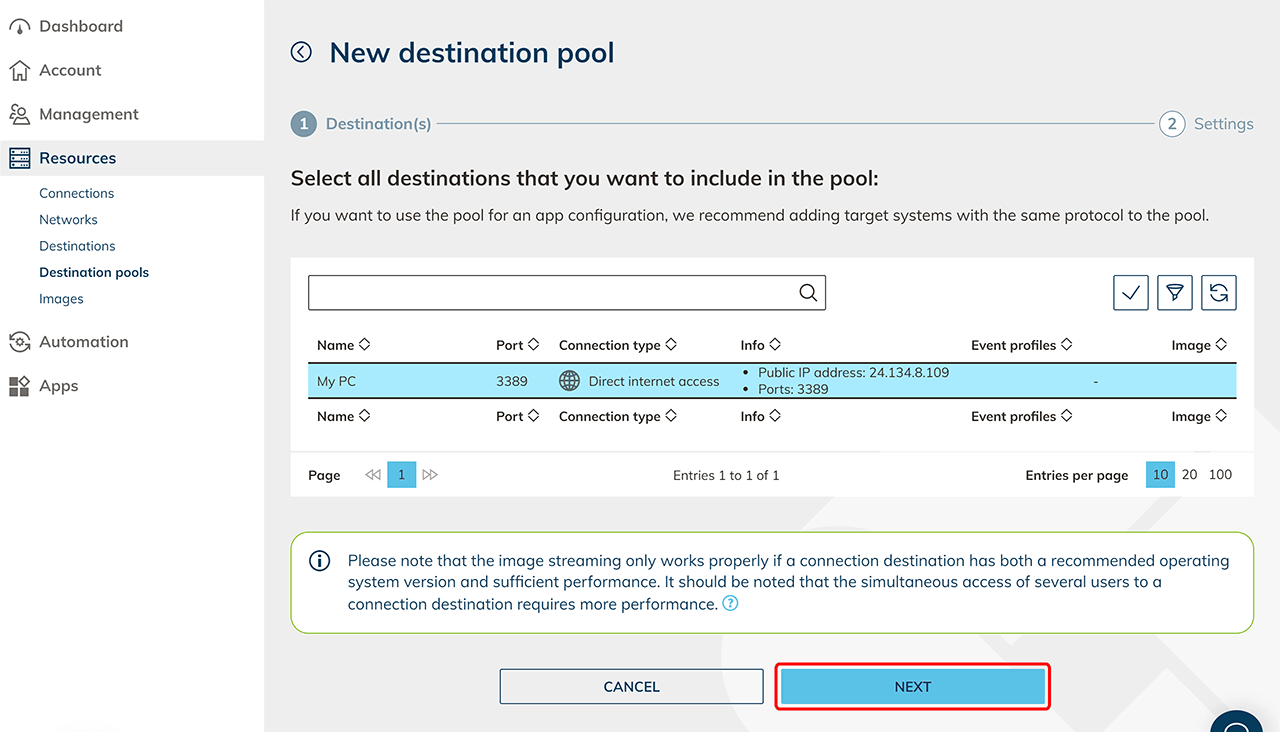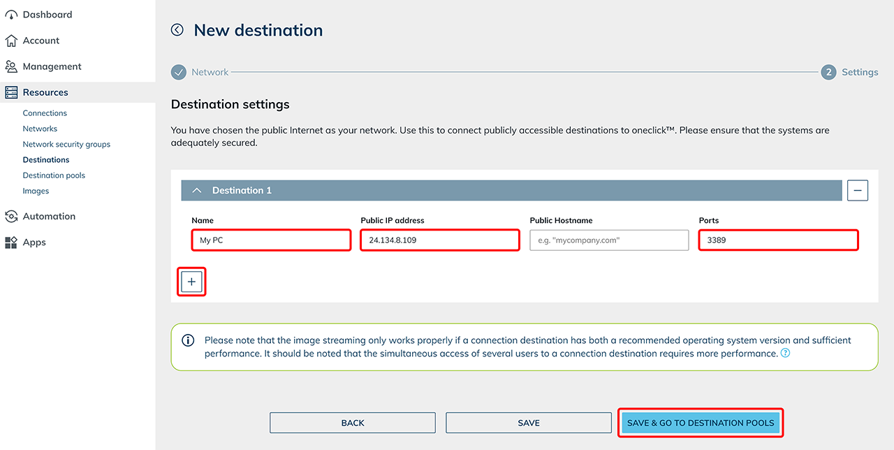 - Assign a "destination name", e.g. My PC. You have to recognize this destination name later.