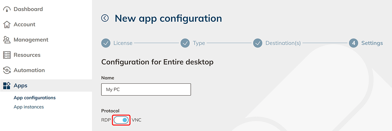 To connect through oneclick™ to a local Mac end device or an application running on it, e.g. MacBook or iMac, VNC can be used. VNC is not as performant as RDP.