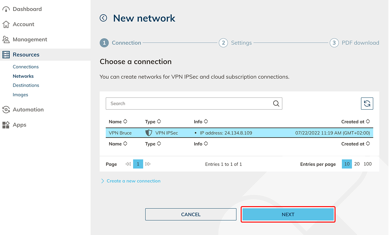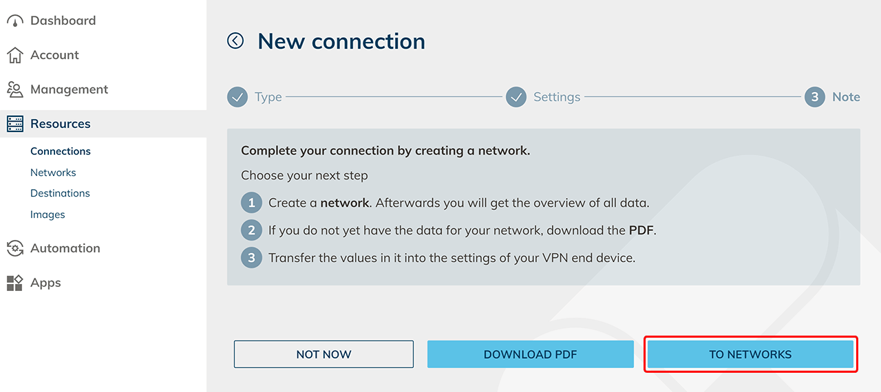- If you have your network data, create a network immediately and take the direct path via the To Networks button. If you do not have any network data yet, you can download the PDF and make the settings already contained in your VPN end device.