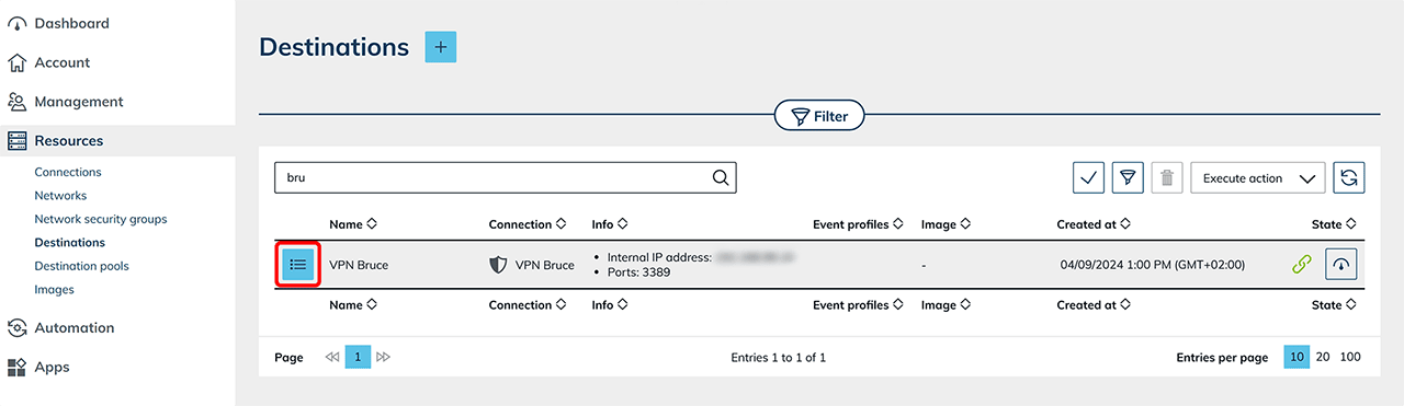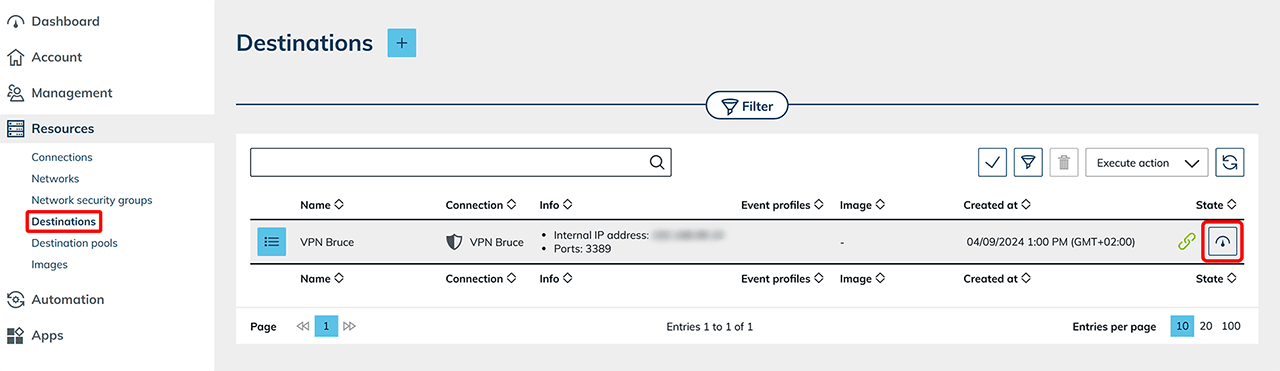- In the row of the desired destination, click the Speedometer icon to test reachability.
