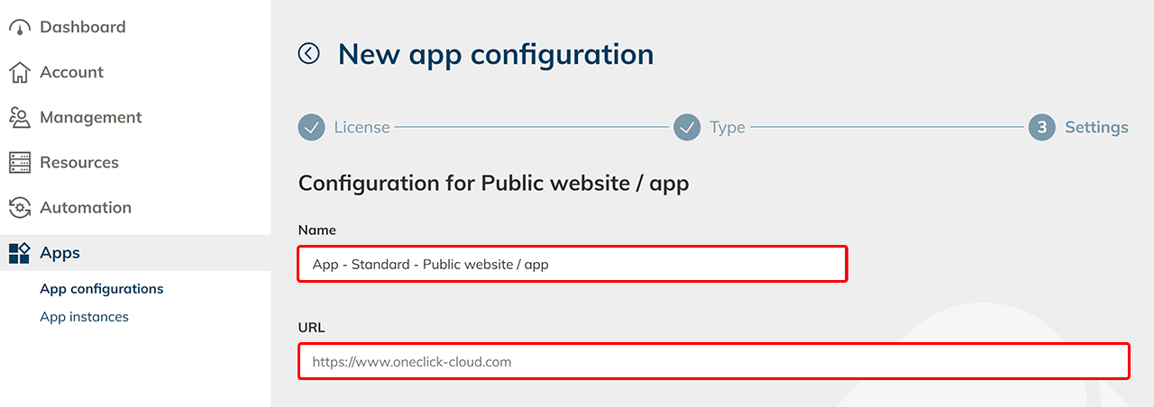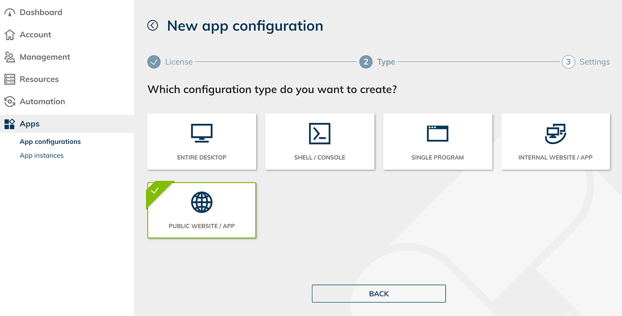 - In the next step you can choose the appropriate configuration type (public Website/App) to access your resources.