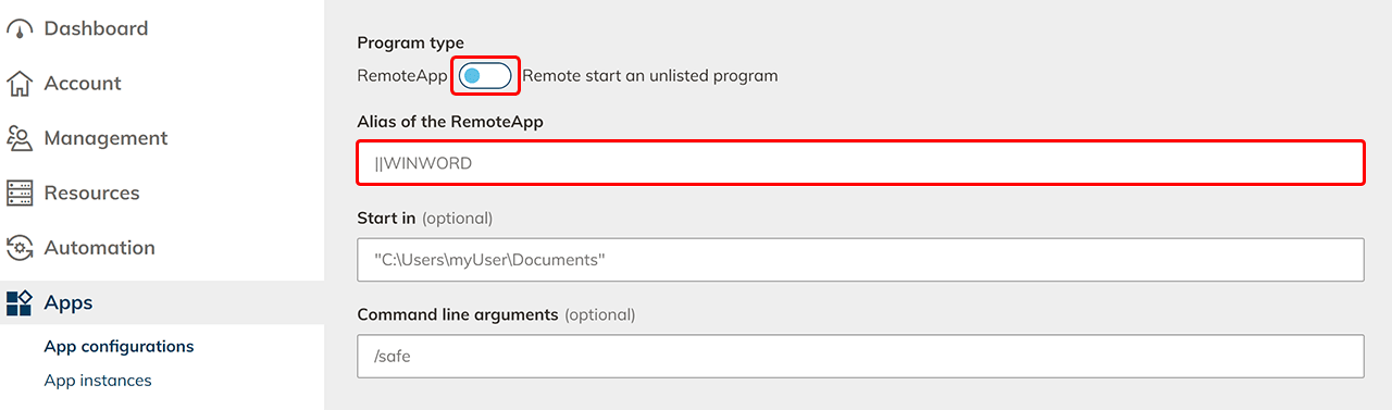 - Enter the alias of the Remote App. Make sure to insert the following two dashes in front of the name: ||