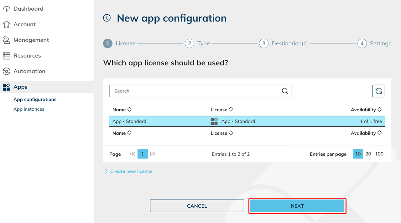 - Select the app license you want to use for this configuration and click Next. Keep in mind that a group license (Pay-Per-Use) can only be assigned to groups later. Individual licenses (Pay-Per-License) can later only be assigned to individual users. You can recognize a group license by the ∞ sign under Availability.