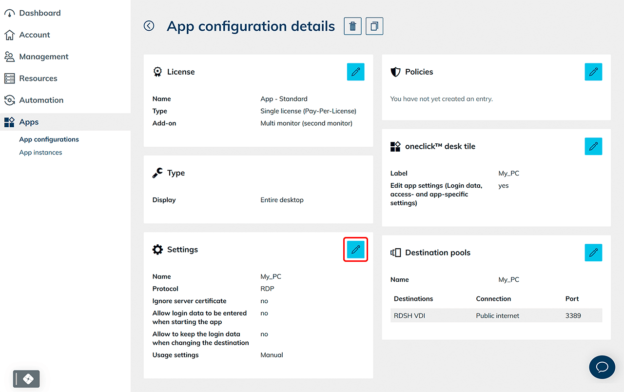 - In the oneclick™ menu, click on the "Apps" tab and then on App configurations.