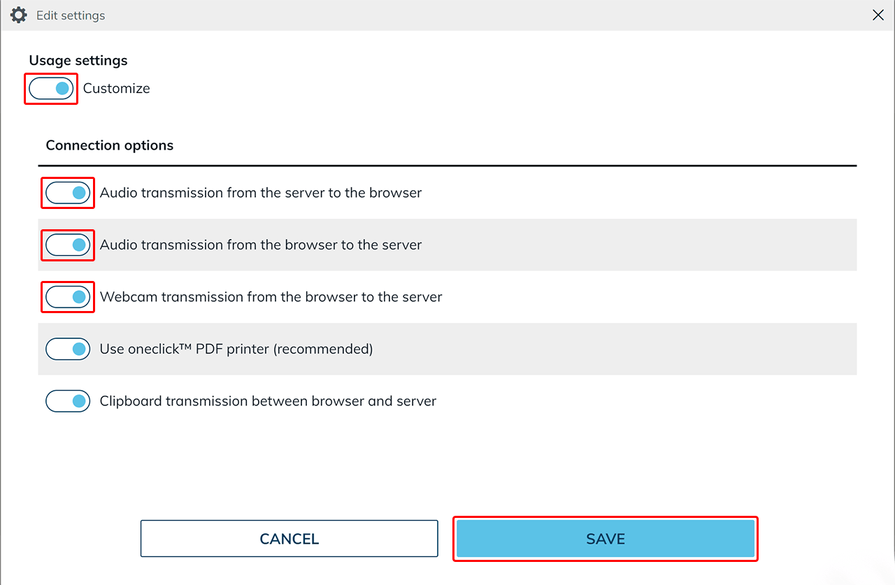 - Activate the items Audio transmission from the server to the browser and Audio transmission from the browser to the server under "Connection options". By activating the switch next to Webcam transmission from the browser to the server, you also enable access to the camera.