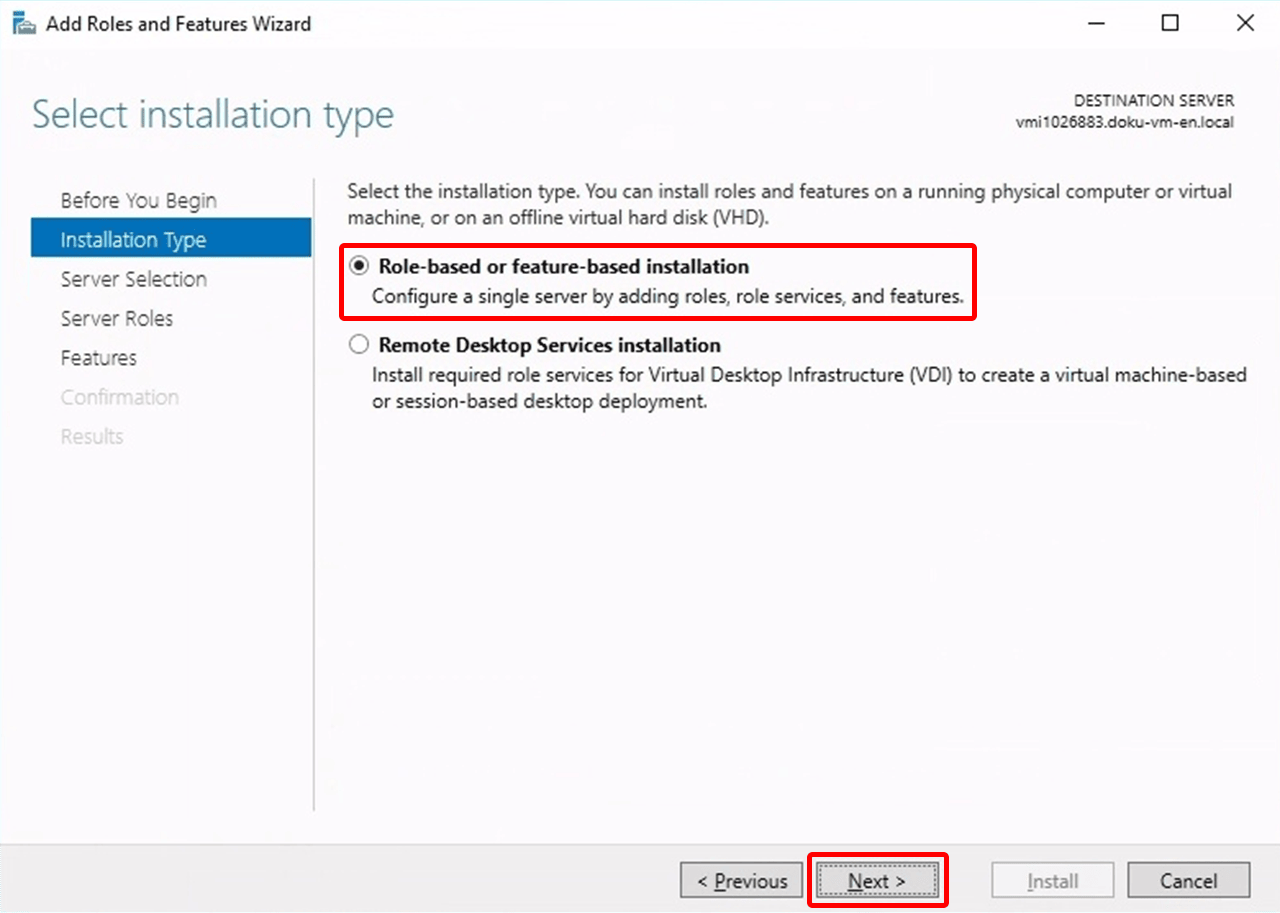 - Under "Installation Type", select Role-based or feature-based installation and click Next.
