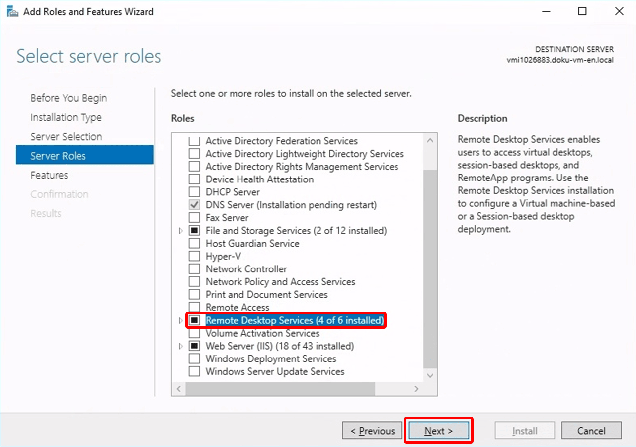 - In the "Server Roles" step, select Remote Desktop Services and click Next.