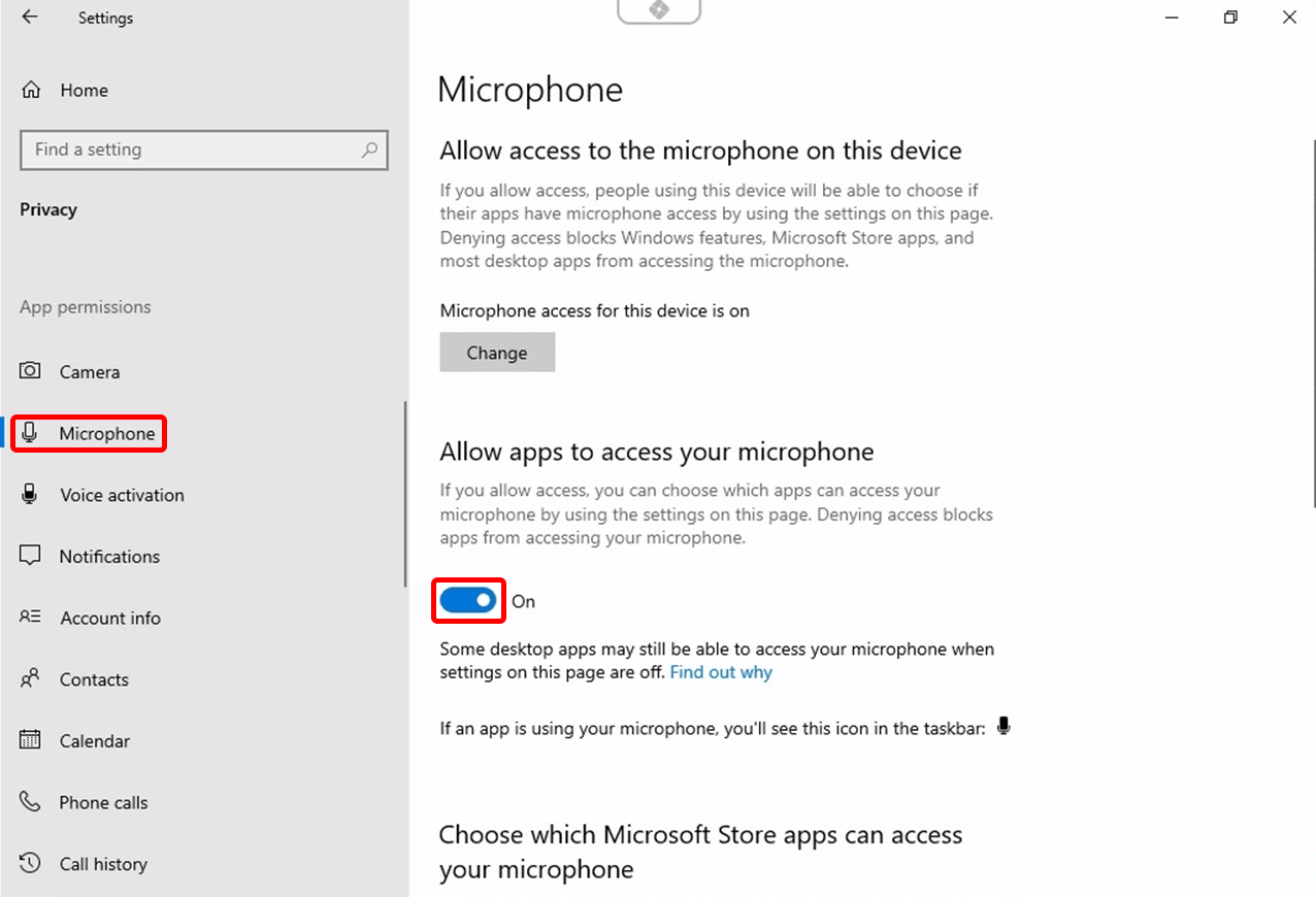Grant the necessary access permission for audio transmission. To do so, switch to this view for the user via Start > Settings > Privacy > Microphone: